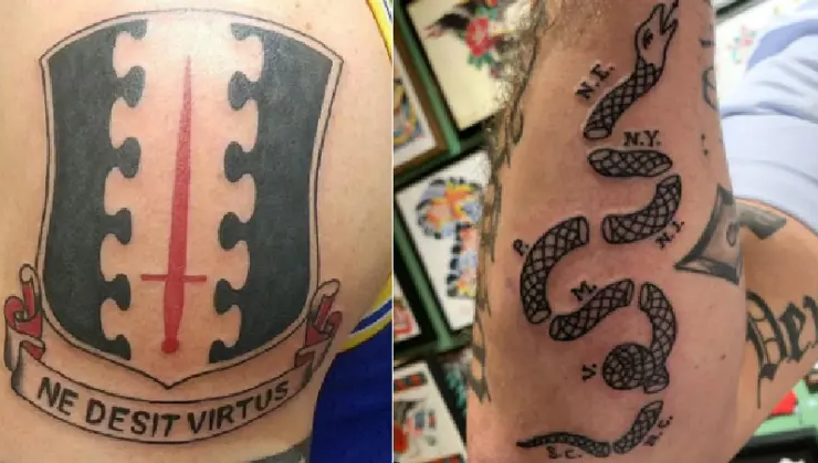 Kolunda yer alan diğer dövme ise Amerikan tarihinde önemli bir yeri olan “Ya katıl ya da öl” sloganıyla birlikte Bağımsızlık Savaşı zamanında Benjamin Franklin tarafından da kullanılan yılan tasviri. Parçalara ayrılmış yılanın her parçası o dönem birer koloni olan eyaletleri temsil ediyor.