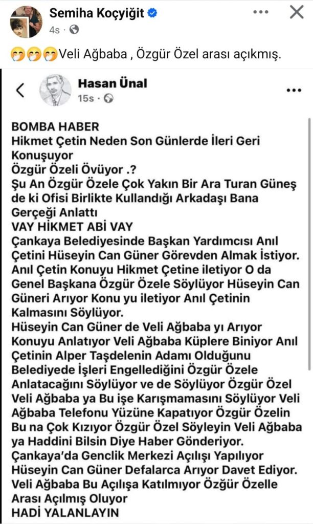 Haliyle kararını ve oyunu Hikmet Çetin’den yana kullanan Özgür Özel ‘’ Söyleyin Veli Akbaba’ya bu işe karışmasın ve kenara çekilsin’’ bu diyalog Özgür Özel ile Akbaba Veli arasında telefonla cereyan ederken gereksiz şımartılmış sinek sıklet veli, ağır sıklet ve ağır abi rolüne bürünerek telefonu Özgür Özel’in yüzüne kapatıyor.