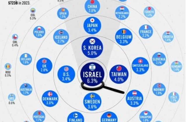 Görselde yer alan veriler, ülkelerin Ar-Ge’ye ne kadar bütçe ayırdığını gayrisafi yurt içi hasıla (GSYH) oranına göre gösteriyor. 2023 yılı verilerine göre İsrail, Ar-Ge’ye GSYH’sinin %6.3’ünü ayırarak dünya lideri olurken, onu Güney Kore ve Tayvan gibi Asya’nın teknoloji devleri izliyor. Avrupa ülkeleri de ciddi yatırımlar yaparak listeye üst sıralardan giriyor.