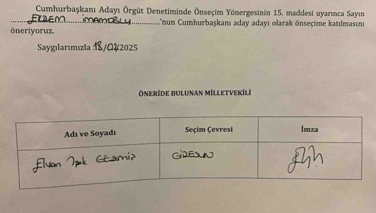 .Manşetin devamı ‘’ CHP’de Ekrem İmamoğlu’nun cumhurbaşkanlığı adaylığı için imza verilmeye başlandı. İmamoğlu’na destek olmak isteyen milletvekilleri parti grubuna giderek imzalarını atıyor.