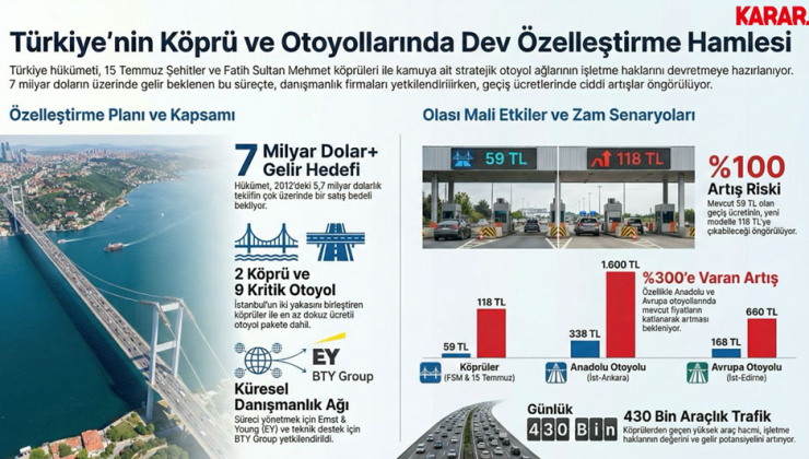 “Karayolları Genel Müdürlüğü verilerine göre, köprülerin yıllık net geliri yaklaşık 112 milyon dolar seviyesinde. 25 yıllık projeksiyonda bu rakam 2,8 milyar doları buluyor. Ancak özelleştirme ile birlikte şirket kârı eklendiğinde geçiş ücretlerine yüzde 100 oranında zam yapılabileceği ve mevcut 59 TL’lik ücretin, Yavuz Sultan Selim Köprüsü model alınarak 118 TL’ye çıkarılabileceği öngörülüyor.”