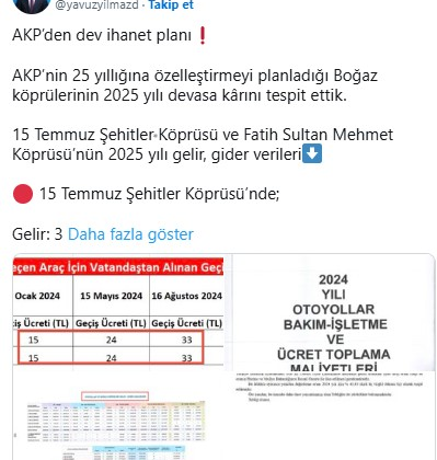 Yavuzyılmaz, sosyal medya hesabı üzerinden yaptığı detaylı paylaşımda, AK Parti iktidarının 25 yıllığına özelleştirmeyi planladığını öne sürdüğü 15 Temmuz Şehitler Köprüsü ve Fatih Sultan Mehmet (FSM) Köprüsü’nün 2025 yılı gelir-gider bilançolarını mercek altına aldı.