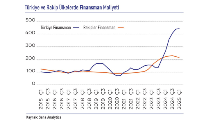 Yüksek faiz oranlarının etkisiyle finansman maliyetleri Türkiye’de artış eğilimini sürdürüyor. 2025’in ilk çeyreğinde endeks, bir önceki döneme göre yüzde 0,8 arttı. Aynı dönemde rakip ülkelerde ise finansman maliyetleri düşme eğilimindeydi.