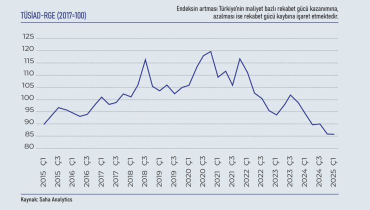 TÜSİAD’ın ihracatçı sektörlerin maliyetlerini izlediği Rekabet Gücü Endeksi (TÜSİAD-RGE), 2025 yılının ilk çeyreğinde 86,1 seviyesinde sabit kalsa da yıllık bazda yüzde 8,9’luk düşüş kaydetti. Böylece endeks, 2015 yılındaki seviyesinin de altına gerilemiş oldu. Düşüşte özellikle ara malı ve iş gücü maliyetlerindeki artış etkili oldu.
